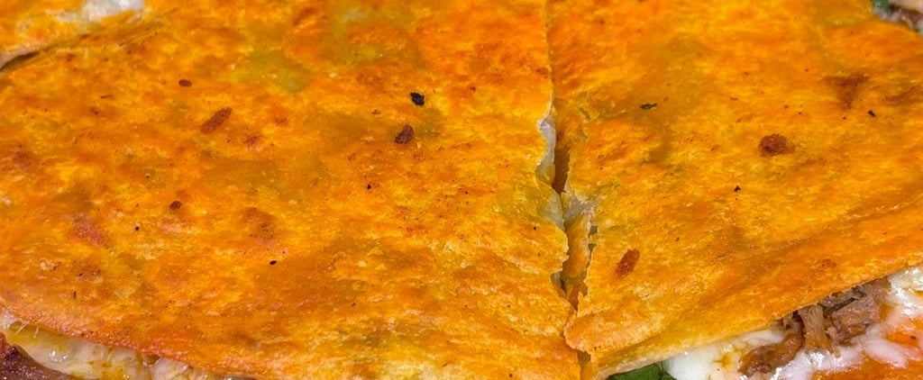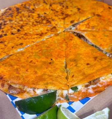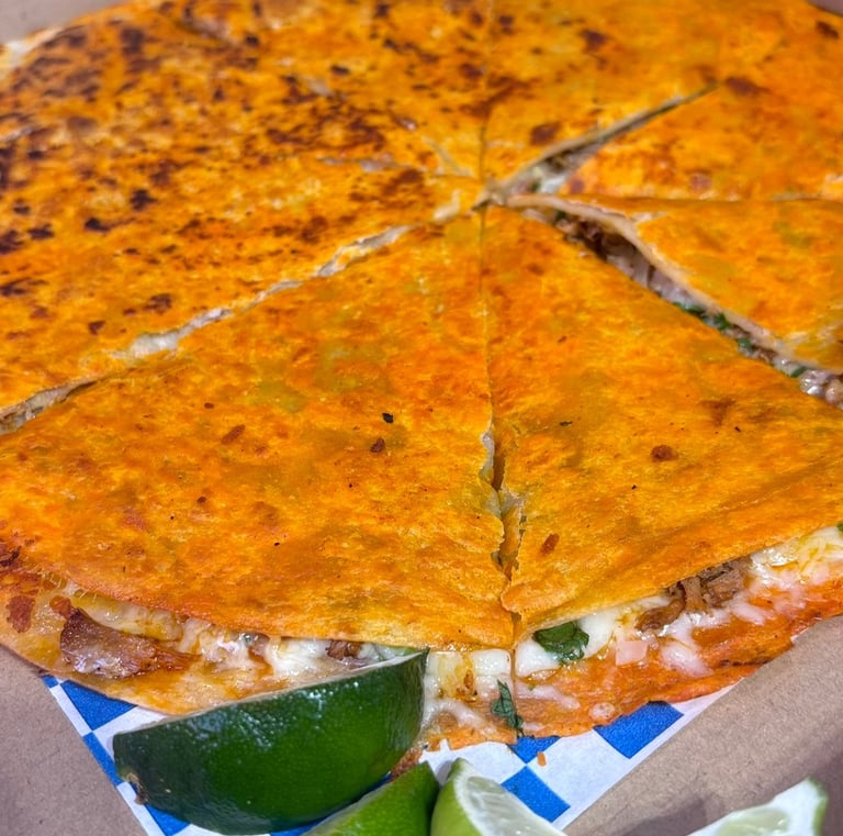 two crispy flour tortillas with melted cheese in the middle, birria onion, cilantro cut into a pizza shape, special for the whole family