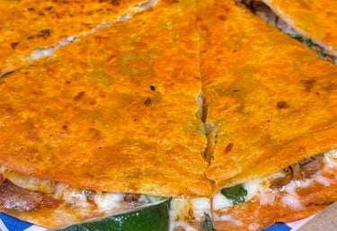A delicious layered treat with two grilled tortillas filled with melted cheese, your choice of meat, onion, cilantro, and salsa. Perfectly cheesy and flavorful!